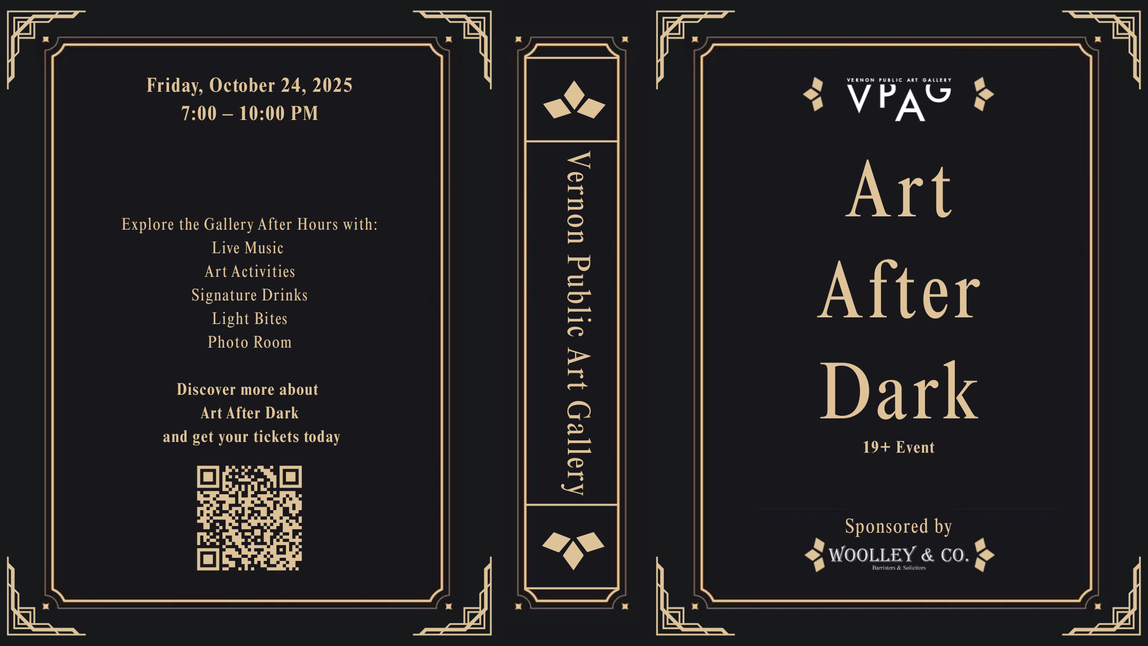 Step behind the gallery doors and into a world of after-hours intrigue and creativity. Proudly sponsored by Woolley & Co., Art After Dark transforms the Vernon Public Art Gallery into a speakeasy-style haven where art, music, and atmosphere intertwine.