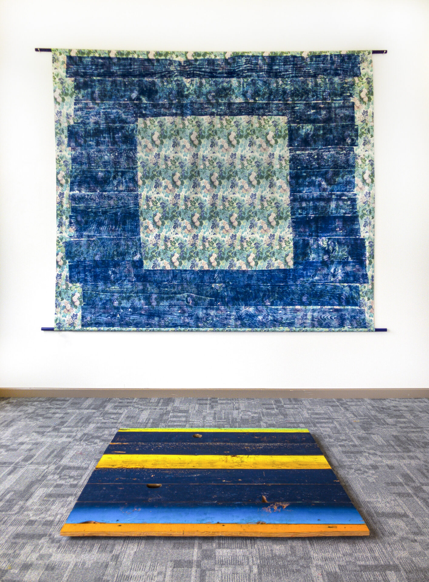 Image Description: Sylvan Hamburger, Open House Press (detail), 2020, relief print on bedsheet, wooden dowels, shiplap boards.